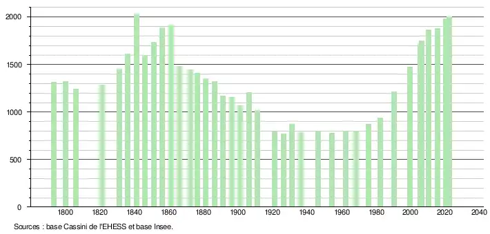 L'évolution du nombre d'habitants est connue à travers les recensements de la population effectués dans la commune depuis 1793. Pour les communes de moins de 10 000 habitants, une enquête de recensement portant sur toute la population est réalisée tous les cinq ans, les populations de référence des années intermédiaires étant quant à elles estimées par interpolation ou extrapolation[17]. Pour la commune, le premier recensement exhaustif entrant dans le cadre du nouveau dispositif a été réalisé en 2005[18].