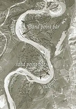 Une barre de méandre le long de la berge convexe est une zone de dépôt tandis que la berge concave est une zone d'érosion.