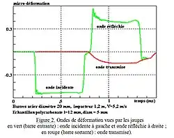 Le choc induit dans la barre entrante une onde incidente qui se propage vers l’échantillon. Lorsqu’elle l’atteint, elle est réfléchie dans la barre entrante et transmise dans la barre sortante. Des jauges de déformation placées sur les barres permettent de mesurer la déformation associée à ces trois ondes (fig. 2).