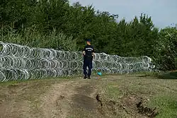 Le franchissement illégal ou la détérioration de la barrière frontière est qualifié de crime (bűntett) et puni d'emprisonnement par une modification du Code pénal hongrois entrée en vigueur le 15 septembre 2015[12]. À cette date, sur les 175 km de frontière avec la Serbie, c'est seulement sur 20 à 25 km difficilement franchissables, surtout marécageux, que la clôture grillagée de 3 à 4 m de haut n'a pas été posée et qu'il n'y a que la barrière à installation rapide en barbelés à lames[13].