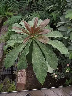 Les feuilles, de 30 centimètres de long et de 12 centimètres de large, sont simples, alternes, décurrentes, d'un vert brillant, regroupées en bout de branches. Les jeunes pousses sont roses. Le feuillage est assez dense et caduc. En saison sèche, avant la floraison, le feuillage peut rougir avant de tomber[2],[3].