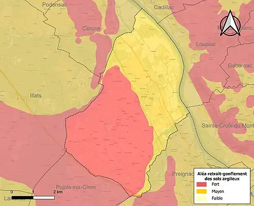 Le retrait-gonflement des sols argileux est susceptible d'engendrer des dommages importants aux bâtiments en cas d’alternance de périodes de sécheresse et de pluie. La totalité de la commune est en aléa moyen ou fort (67,4 % au niveau départemental et 48,5 % au niveau national). Sur les 1 090 bâtiments dénombrés sur la commune en 2019, 1 090 sont en aléa moyen ou fort, soit 100 %, à comparer aux 84 % au niveau départemental et 54 % au niveau national. Une cartographie de l'exposition du territoire national au retrait gonflement des sols argileux est disponible sur le site du BRGM[20],[Carte 2].