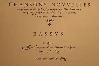 - Chansons nouvelles composées par Barthelemy Beaulegue excellent musicien. Et par luy mises en musique à quatre parties, et en quatre livres. Lyon : impr. de Robert Granjon, 1559 (ténor daté 1558). 4 vol. 8° obl., mus., texte en caractères de civilité[3].