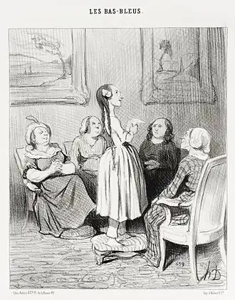 Cependant, si le terme est employé de façon misogyne, il peut être en plus chargé d'une critique de classe en ciblant les travers de bourgeoises ridicules. C'est le cas notamment dans la série des bas-bleus parue en 1844 dans Le Charivari où Daumier s'attaque aux fausses intellectuelles[1].