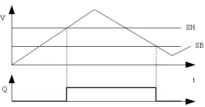 - quand V augmente, Q reste à 0 jusqu'à ce que V dépasse SH ; à ce moment, Q passe à 1 ;