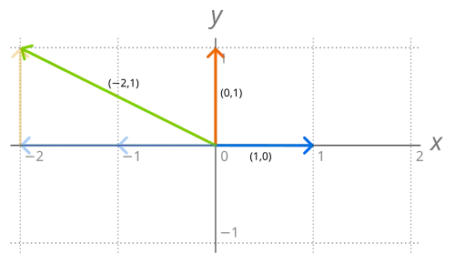 La géométrie plane, celle d'Euclide, peut comporter une approche algébrique, celle de Descartes. En utilisant les coordonnées cartésiennes, on peut identifier un vecteur du plan à un couple de réels. Par exemple, la figure montre comment placer le vecteur . On se sert alors des deux vecteurs de référence (dessinés en violet et rouge) pour le dessiner. Ainsi, tous les vecteurs du plan peuvent être exprimés de manière unique en termes de nombres vis-à-vis de deux vecteurs de référence. Ces deux vecteurs sont appelés base canonique du plan. En les notant respectivement et , un vecteur quelconque du plan s'exprime comme combinaison linéaire de ces deux vecteurs :