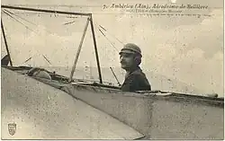 Marius Lacrouze installé à bord d'un monoplan Éparvier sur le terrain d'aviation d'Ambérieu, au début des années 1910.