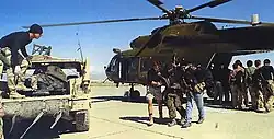 Des Special Forces aidant un membre de l'Alliance du Nord sur la base aérienne de Bagram. À l'arrière plan, un Mi-17 affrété par la CIA durant l'opération Anaconda en 2002.