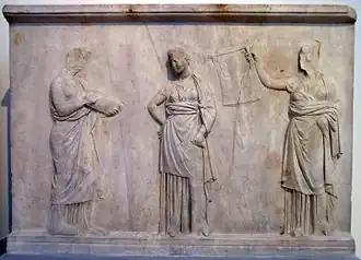 Les deux autres plaques représentent des Muses qui, selon certaines versions du mythe de Marsyas, sont les juges du concours[5]. MNA 215 montre un premier groupe de trois Muses : celle de gauche porte un aulos, celle du milieu tient les pans de son himation dans lequel elle est enroulée, celle de droite est assise et joue d'un petit instrument à cordes, peut-être une pandore ou un tricorde[2]. Sur MNA 216, la Muse de gauche tient un parchemin déroulé, celle du centre tient un rouleau fermé dans la main gauche et celle de droite lève de la main droite une cithare. Les Muses étant canoniquement au nombre de neuf à l'époque classique, on en a déduit qu'il manquait une quatrième plaque représentant un troisième groupe de trois Muses[3].