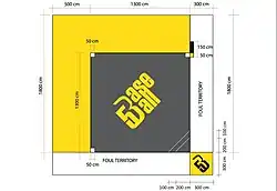L’aire de jeu a la forme d’un carré de 18 mètres de côtés. L’un des angles droits du carré coïncide avec le marbre. Le champ intérieur est de forme carrée avec une base à chaque angle droit. La distance entre ces bases est de 13 mètres. Le carré de frappe a des dimensions de 3 mètres de côté.