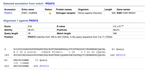 - après extension de l'homologie, il évalue à partir du score obtenu la probabilité que celle-ci soit due au hasard (ou plus exactement, son espérance mathématique).
