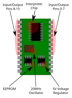 Bien que le BASIC Stamp 2 ait la forme d’un DIP à 24 broches, il s’agit en réalité d’un petit circuit imprimé contenant les éléments essentiels d’un système à microprocesseur[1] :