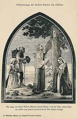 Le lieu où s’élève aujourd’hui la basilique Notre-Dame du Chêne appartenait à l’ancienne province de l’Anjou, mais situé près des limites du Maine. D’abord connu sous l'appellation de « Chêne de la Jarriaye », il est devenu au fil du temps un sanctuaire marial. Il est dit qu’à la fin du XVe siècle des pâtres qui conduisaient leurs troupeaux dans la lande remarquèrent que bon nombre de colombes voltigeaient autour d'un vieux chêne. Intrigués, ils restèrent jusqu’au soir quand ils furent les témoins de feux qui brillaient jusqu'à sembler couronner d’un diadème la cime de l'arbre.