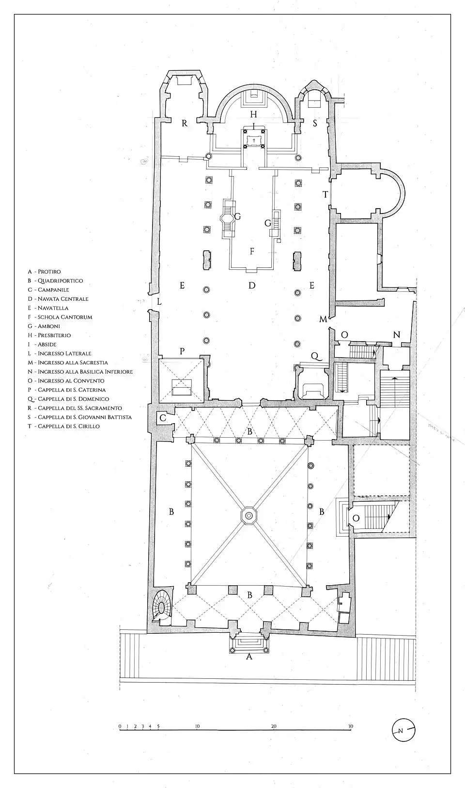 Son entrée d'origine (remplacée par une entrée latérale) donne sur une cour entourée d'un péristyle (B sur le plan), formant l'unique atrium médiéval qui subsiste encore à Rome[23]. Il sert aujourd'hui de cloître entouré des bâtiments conventuels. Au fond se trouve la sobre façade de Stefano Carlo Fontana, supportée par des colonnes antiques, et le petit campanile.