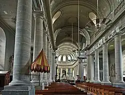 La basilique de style néo-Renaissance construite entre 1843 et 1865[3] affecte un plan en croix latine, les bras du transept se terminant en hémicycle. Nonobstant, la distribution et la circulation internes confèrent à l'édifice un caractère basilical marqué, la croisée n'étant pas d'ailleurs surmontée d'une coupole. La nef centrale, accostée de deux collatéraux, est rythmée par une colonnade toscane portant architrave, frise ornée de triglyphes, et forte corniche. Au-dessus d'une balustrade, l'éclairage est assuré de part et d'autre par trois baies à lunettes dont les voûtes pénètrent celle de la nef, plein-cintre et ornée de caissons. Le chœur poursuit le parti fort sobre de la nef : son hémicycle est entouré d'un déambulatoire sur lequel se greffe seulement une chapelle absidale. L'espace intérieur de la basilique se caractérise donc par une certaine austérité et monochromie qu'altèrent à peine le dallage de marbre noir et blanc et le mobilier d'esprit néoclassique.