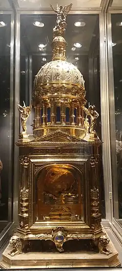 Dans la salle des trésors, on peut voir, depuis la fin du XIXe siècle, un reliquaire qui contiendrait le crâne de saint Aubert. Ce crâne percé, exhumé au début du XIe siècle, attesterait pour certains de l'intervention de l'archange saint Michel. L'étude de la relique par une équipe de scientifique a révélé que la perforation serait due à une affection bénigne nommée « kyste épidermoïde »[6].