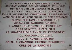 Plaque commémorant son élévation par le pape Pie X au rang de basilique mineure.