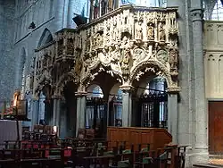 - Un remarquable jubé en pierre blanche ferme le chœur en le séparant du transept. Il est daté de 1531. Vingt-neuf niches abritent des statuettes des saints régionaux et personnages bibliques ; elles sont de dimension et style divers. Surmonté d'un calvaire de grande dimension le jubé est timbré aux armes de Charles Quint, ce qui fait penser qu'il fut peut-être offert par l’empereur.