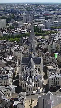 Sous l'impulsion de Félix Fournier, curé de la paroisse et futur évêque de Nantes, la construction de l'église actuelle s'échelonne de 1844 (pose de la première pierre) à 1869 (bénédiction de l'édifice)[9] sur un terrain exigu qui l'oblige à être orientée sur un axe nord-sud, et non pas est-ouest comme le voudrait la tradition chrétienne (soleil levant sur le sanctuaire). L'édification du clocher occupe à elle seule les quinze dernières années des travaux. Une médaille commémorative célèbre la pose de la première pierre de la nouvelle église, sous le règne de Louis-Philippe, l'administration du préfet Achille Chaper et du maire Ferdinand Favre[10]. L'église est bâtie en granite de la région, ainsi qu'en pierres dures et tuffeau de Touraine. Le projet est confié à Jean-Baptiste-Antoine Lassus[11], élève de Henri Labrouste et collaborateur de Eugène Viollet-le-Duc, qui en fait, avec Piel[12], l'un des tout premiers projets néo-gothiques en France[Note 1]. Elle est érigée en basilique mineure le par le pape Léon XIII[13].