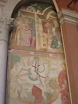 L'entrée de l'église se trouve sur le côté gauche du cloître. Des restes de la façade de l'ancienne basilique sont visibles sur les côtés droit et gauche du portail du XVe siècle avec un portique comprenant quelques fresques des XVe et XVIe siècles.