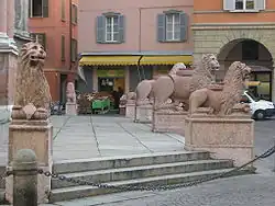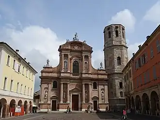La façade remonte au milieu du XVIIIe siècle, œuvre de Gian Battista Cattani [3], et montre onze statues de saints et Docteurs de l'Église. On remarque devant l'édifice six lions de marbre rouge de Vérone ; ils devaient servir à soutenir les colonnes de trois pronaos devant les portes de la basilique. Ces sculptures (1503) sont attribuées à Gaspare Bigi, natif de Reggio, et n'ont jamais été terminées. Les lions ont été placés de cette manière en 1748. L'on pense aussi que ces lions auraient été sculptés plutôt à l'époque romane et que Gaspare Bigi n'aurait sculpté que leurs bases. Sur l'un des fondements, on aperçoit le profil de Girolamo Pratonieri, noble illustre de la ville, qui fit reconstruire la basilique sur ses deniers. Le campanile de forme octogonale se trouve à droite de la façade. Il a été construit selon les plans de Cristoforo Ricci et revu selon le projet de Giulio Romano. Il est demeuré incomplet.
