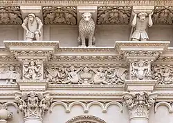 La partie inférieure de la façade est construite dans le style classique de la Renaissance lors de la première phase des travaux (1549 à 1580) ainsi que la coupole, à la croisée du transept, qui est achevée en 1590. Ces premiers travaux sont dus à Gabriele Riccardi, premier architecte célèbre de Lecce et précurseur du baroque. Une seconde tranche de travaux, à partir de 1606, voit l'adjonction des trois portails baroques de la façade : ils sont l'œuvre de Francesco Antonio Zimbalo, premier architecte purement baroque de Lecce. Cependant, la partie la plus extravagante de la façade, c'est-à-dire les seconds et troisième ordres (au-dessus du balcon ouvragé) avec la rosace (terminée en 1646) est l'œuvre de Cesare Penna et de Giuseppe Zimbalo, ce dernier ayant aussi établi les plans du Palais des Célestins attenant.