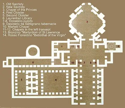 L'église se présente comme une croix latine à trois nefs, avec des chapelles latérales le long des nefs latérales et du transept. À l'intersection des bras se trouve un dôme. L'agencement, comme dans d'autres œuvres de Brunelleschi, s'inspire d'autres œuvres de la tradition florentine médiévale, telles que Santa Croce, la basilique Santa Maria Novella ou Santa Trinita. Inspiré de ces modèles, Brunelleschi a souhaité quelque chose de plus rigoureux, avec des résultats révolutionnaires : l'innovation fondamentale réside dans l'organisation des espaces le long de l'axe médian en appliquant la notion de module à la fois en plan et en élévation, correspondant à la taille d'une travée carrée, avec la base de 11 braccie fiorentine, à peu près la même que le Spedale degli Innocenti construit à partir de 1419, qui fait 10 braccie fiorentine. L'utilisation du module régulier, avec la répétition rythmique conséquente des membres architecturaux, définit un balayage en perspective d'une grande clarté. Les deux bas-côtés sont déterminés comme le développement symétrique de la loggia de l'hôpital, appliqué pour la première fois à l'intérieur d'une église : en effet, ici aussi l'utilisation de la travée carrée et de la croisée d'ogives génère la sensation d'un espace marqué, comme une série régulière de cubes imaginaires surmontés d'hémisphères.