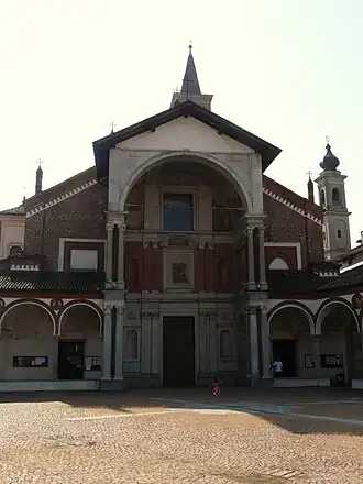 La basilique, construite en 1388 à l'occasion de la naissance du fils de Jean Galéas Visconti dans la ville, possède quatre façades Renaissance avec le grand arc du porche (1497) resté inachevé, par Bramante et qui représente la dernière œuvre réalisée par le maître lombard.