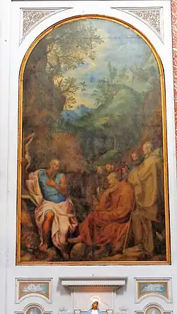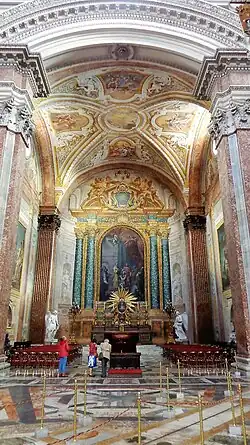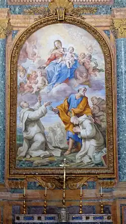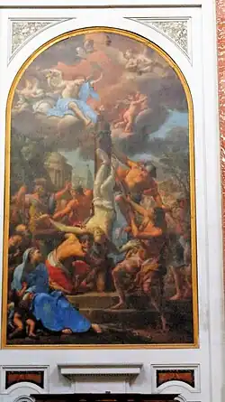Ce tableau a été peint par Pompeo Batoni en 1765. Il semble que la peinture ne faisait pas partie de la série originale de peintures transférées de la basilique vaticane à cette basilique[30].