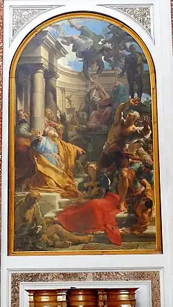 Il s'agit d'une copie réalisée par Pierre Charles Trémolliére du tableau de Francesco Vanni qui se trouve sur l'autel du Sacré-Cœur à Saint-Pierre. Le tableau raconte la chute de Simon Magus qui voulait acheter à saint Pierre la capacité de faire des miracles. Le tableau symbolise la suprématie de l'orthodoxie catholique sur l'hérésie[26].