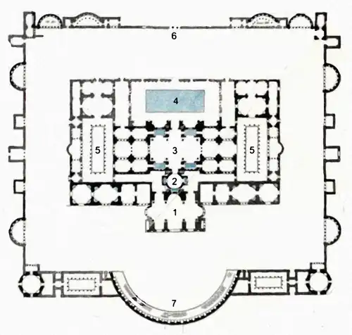 Plan des thermes : 1. Caldarium ; 2. Tepidarium ; 3. Frigidarium ; 4. Natatio ; 5. Palaestra ; 6. Entrée ; 7. Exèdre.