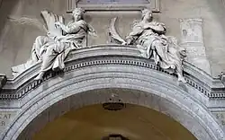 Le Bernin a ajouté les deux moitiés d'un fronton segmentaire cassé sur les côtés du niveau supérieur, remplaçant les volutes d'origine, et l'élément de liaison incurvé avec les riches guirlandes de chêne. Les deux torches enflammées et les six montagnes, symboles de la famille Chigi, sont d'autres ajouts baroques. Le fronton simple était à l'origine décoré des armoiries du pape Sixte IV accrochées à un encorbellement en feuille d'acanthe, mais seule la partie supérieure tronquée de l'écu a survécu.