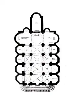 Peu de temps après son transfert à la prestigieuse Congrégation lombarde, entre 1472 et 1477, Santa Maria del Popolo est reconstruite sur les ordres du pape Sixte IV dans le cadre de l'ambitieux programme de rénovation urbaine du pape qui se présente comme le restaurateur Urbis de Rome[18]. L'église médiévale est entièrement démolie et une nouvelle basilique à trois nefs, en forme de croix latine, est construite avec quatre chapelles identiques des deux côtés, un dôme octogonal au-dessus de la croisée du transept et un haut clocher de style lombard à l'extrémité du transept droit. Cette reconstruction est un exemple précoce de l'architecture de la Renaissance italienne à Rome. Malgré les nombreux changements ultérieurs, la basilique a, pour l'essentiel, conservé sa forme Sixtine jusqu'à aujourd'hui.
