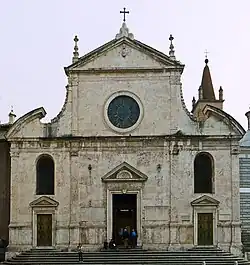 La façade est construite au début de la Renaissance, dans les années 1470, lorsque l'église médiévale est reconstruite par le pape Sixte IV. Elle est plus tard retravaillée par Le Bernin au XVIIe siècle, mais les sources picturales ont conservé sa forme originale, par exemple une gravure sur bois dans le guide de Girolamo Franzini en 1588[27] et une vue par Giovanni Maggi en 1625[28]. À l'origine, il y avait des panneaux d'entrelacs dans les fenêtres et des rayons à la rosace centrale ; le bâtiment était autoportant avec une vue dégagée sur le clocher et une rangée de chapelles latérales identiques sur la droite.