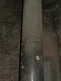 - ↑ Les géologues ne sont pas d'accord entre eux quant à la nature du ou des marbres ; l'université de géologie de Padoue considère qu'elles sont en marbre cipolin provenant de la ville grecque de Karystos, le département de géologie de l'université de Bologne soutient qu'au moins 4 des colonnes sur les 7 sont en marbre africain ou de Lucullo dont les carrières se trouvent dans l'actuelle Turquie.