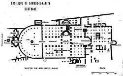 Immense édifice au départ (mesurant 65 mètres sur 45[3] avec neuf nefs et onze travées pour l'espace central), le site se compose, outre la basilique, d'un baptistère et d'un ensemble pouvant avoir abrité des moines (ou des religieuses selon Delattre[42]). Dans son dernier état, le monument est très réduit, avec trois nefs et cinq travées uniquement, ce qui dénote une forte dégradation[43].