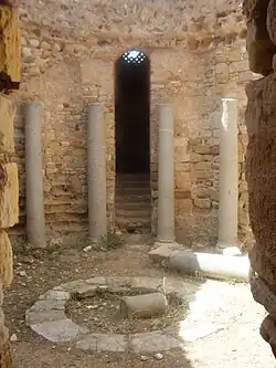 La crypte contenait seize colonnes de marbre rose, hautes de 3,45 mètres et distantes l'une de l'autre de 1,60 mètre[53], ainsi que des niches. Une seule colonne était intacte, les autres ayant été redressées par l'équipe de fouille[55]. Des chapiteaux de l'époque de Théodose ont été retrouvés dans le monument et déposés au musée Lavigerie. Ils étaient décorés d'aigles ou de béliers et alternaient avec des niches[19]. Le sol portait une mosaïque en mauvais état[56] et un stylobate de deux mètres de diamètre ayant peut-être comporté des colonnes.