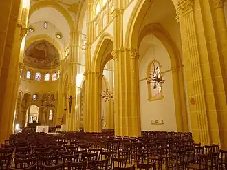 Les grandes arcades, à arc brisé, de la nef, dans le style roman bourguignon, occupent deux tiers de l'élévation, le tiers restant étant occupé par une arcature aveugle surmontée de la rangée des fenêtres hautes. C’est une disposition inspirée de l'église de Cluny.