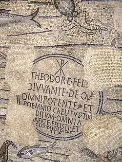 L'épigraphe faisant référence à l'évêque Théodore est située presque au centre du tapis marin, pour compléter la mosaïque après la disparition de Théodore, où l'on peut lire :