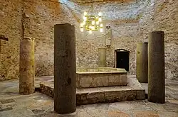 Les fonts baptismaux, de forme hexagonale, se trouvent au centre de la pièce ; ils furent restaurés en 1739 aux frais de Charles VI (empereur du Saint-Empire). Des fouilles datant du début des années 1980 ont mis au jour des vestiges de l'ancien réservoir, de forme octogonale.
