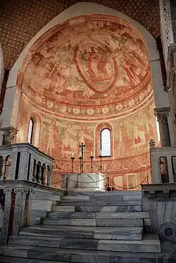 Au-dessus de la crypte, les fresques de la voûte de l'abside, mises au jour à la fin du XIXe siècle, représentent la Vierge à l'Enfant, des saints, des martyrs et l’évêque Poppon, dont une Vierge à l'enfant intronisée entourée de symboles évangéliques et les Saints d'Aquilée, placés sur les côtés. Parmi ces derniers, à gauche, entre les première et deuxième figures, est représenté Le patriarche Poppon présentant le modèle de la Basilique à la Vierge, tandis qu'à droite, entre les saints Hermagore et Fortunato, figure l'empereur Conrad II le Salique ; dans les deux cas, les personnages sont peints dans des dimensions plus petites.