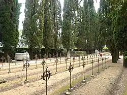 À l'extérieur, autour de l'abside de la basilique, se trouve le cimetière des morts de la Première Guerre mondiale, où reposent dix des onze soldats inconnus, dont Maria Bergamas, mère d'un volontaire tombé sur les hauts plateaux de Vicence, parmi lesquels a été choisi celui dont la dépouille mortelle repose au monument à Victor-Emmanuel II à Rome depuis 1921. Les tombes du général Alessandro Ricordi de Milan, commandant de la brigade Murge, ainsi que celle du capitaine Riccardo della Torre di Cividale, tué par la même grenade sur les pentes du mont Ermada s'y trouvent également.