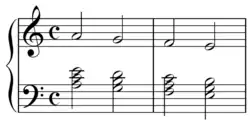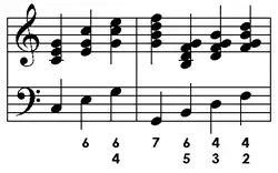 Les chiffrages d'accords tels qu'ils sont décrits ci-dessous sont le dernier état d'une évolution. En réalité, à l'époque de la basse continue, ils pouvaient être différents : la septième de dominante ne s'écrivait pas 7/+ mais 7, on n'écrivait pas +6/3 mais 6 barré, etc. L'exemple suivant permet d'apprécier la différence entre un chiffrage baroque de 1716 (Campion)[2], noté au-dessus de la basse, et son équivalent moderne[3], donné sous la basse :