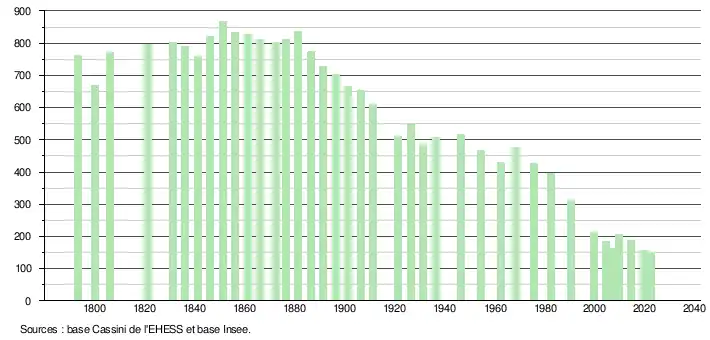 | L'évolution du nombre d'habitants est connue à travers les recensements de la population effectués dans la commune depuis 1793. Pour les communes de moins de 10 000 habitants, une enquête de recensement portant sur toute la population est réalisée tous les cinq ans, les populations de référence des années intermédiaires étant quant à elles estimées par interpolation ou extrapolation[21]. Pour la commune, le premier recensement exhaustif entrant dans le cadre du nouveau dispositif a été réalisé en 2004[22]. En 2022, la commune comptait 152 habitants[Note 3], en évolution de −19,58 % par rapport à 2016 (Corrèze : −0,59 %, France hors Mayotte : +2,11 %). |