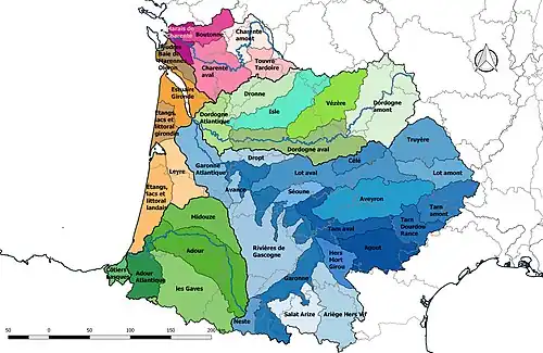Le bassin hydrographique est découpé en cinq régions hydrographiques, correspondant aux bassins versants des principaux grands fleuves (Charente, Dordogne, Garonne, Adour et le bassin des fleuves côtiers), secteurs, sous-secteurs et zones hydrographiques.