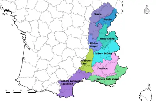 Le bassin comprend dix sous-bassins administratifs : Saône - Doubs - Haut-Rhône - Rhône moyen - Ardèche-Gard - Isère-Drôme - Durance - Côtiers Côte d'Azur - Côtiers Languedoc-Roussillon. Ils constituent un niveau intermédiaire d’agrégation entre la masse d'eau et le bassin Directive cadre de l'eau, à savoir le district hydrographique. Ils ont été mis en œuvre fin 2008 à la demande de la Commission européenne pour des objectifs de rapportage et de visualisation au sein de WISE (Water Information System for Europe)[3].