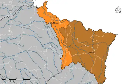 Les bassins hydrographiques sont découpés dans le référentiel national BD Carthage en éléments de plus en plus fins, emboîtés selon quatre niveaux[4] : régions hydrographiques, secteurs hydrographiques, sous-secteurs hydrographiques et zones hydrographiques. Le bassin Rhin-Meuse est découpé en deux régions hydrographiques.