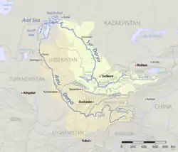 - Le sous-bassin de la mer d'Aral coïncide géographiquement avec presque toute la région d'Asie centrale, plus précisément l’ensemble du territoire des Tadjikistan, Ouzbékistan, la majorité du Turkménistan, trois provinces de la République kirghize (Och, Jalalabad et Naryn), la partie méridionale du Kazakhstan (deux provinces: Kyzyl-Orda et Sud-Kazakh) et la partie nord de l’Afghanistan et de l’Iran[1]. Il est constitué de ses sous-bassins, celui de l'Amou-Daria et le Syr-Daria (auxquels il faut ajouter le Murghab et le Hari Rûd qui se perdent par épuisement dans le Désert du Karakoum).