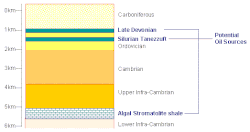 Les forages de prospection entrepris dans les années 1980 ont révélé la présence de pétrole dans les couches de la fin du Précambrien, du Silurien et de la fin du Dévonien[4]. Les couches de sédiments sont plus épaisses dans la moitié occidentale de la dépression[5].