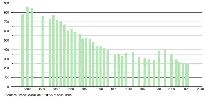 L'évolution du nombre d'habitants est connue à travers les recensements de la population effectués dans la commune depuis 1793. Pour les communes de moins de 10 000 habitants, une enquête de recensement portant sur toute la population est réalisée tous les cinq ans, les populations de référence des années intermédiaires étant quant à elles estimées par interpolation ou extrapolation[29]. Pour la commune, le premier recensement exhaustif entrant dans le cadre du nouveau dispositif a été réalisé en 2005[30].